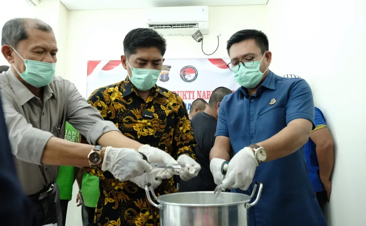 Pemusnahan dilakukan dengan cara merebus sabu bersama air dan detergen, lalu limbah dibuang ke septic tank. Para tersangka dijerat Pasal 114 atau Pasal 112 UU RI No. 35 Tahun 2009 tentang Narkotika, dengan ancaman hukuman berat, termasuk hukuman mati.