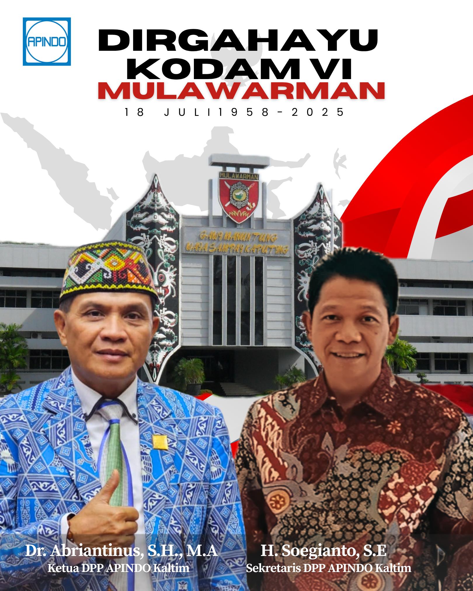 Balikpapan(18/7),Nansarunai.com – Dalam momen peringatan Hari Ulang Tahun (HUT) ke-67 Kodam VI/Mulawarman, Dr. Abriantinus, S.H., M.A., Ketua DPP APINDO Kalimantan Timur, turut menyampaikan ucapan selamat dan apresiasi kepada jajaran Kodam VI/Mulawarman atas dedikasi dan pengabdiannya dalam menjaga stabilitas dan ketenteraman wilayah Kalimantan.
