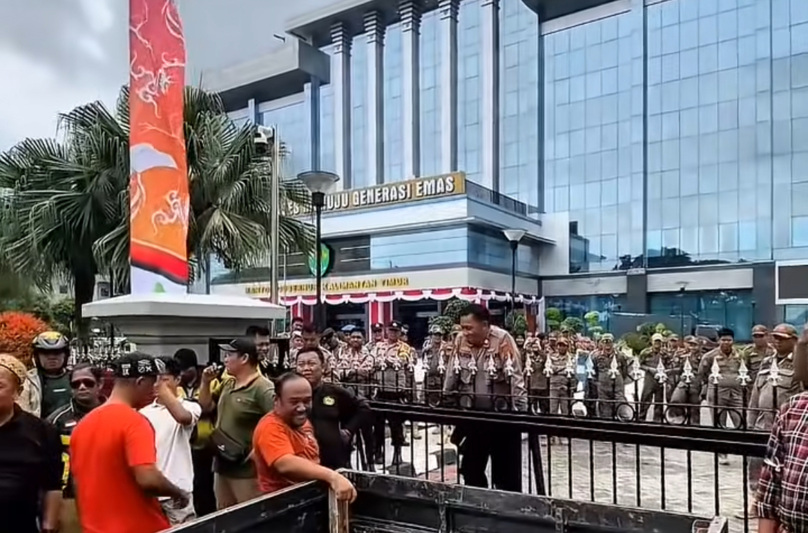 Samarinda(4/8), Nansarunai.com – Ratusan pengemudi ojek online (ojol) mendatangi Kantor Gubernur Kalimantan Timur, Senin (4/8), untuk menyampaikan protes atas penyegelan kantor operasional mereka oleh Satpol PP. Aksi tersebut diawali dengan kunjungan ke Kantor Dinas Perhubungan (Dishub) Kaltim, namun merasa tidak mendapatkan jawaban memuaskan, massa kemudian bergerak menuju halaman Kantor Gubernur.